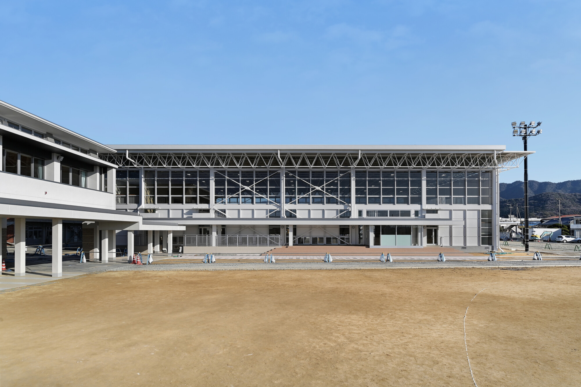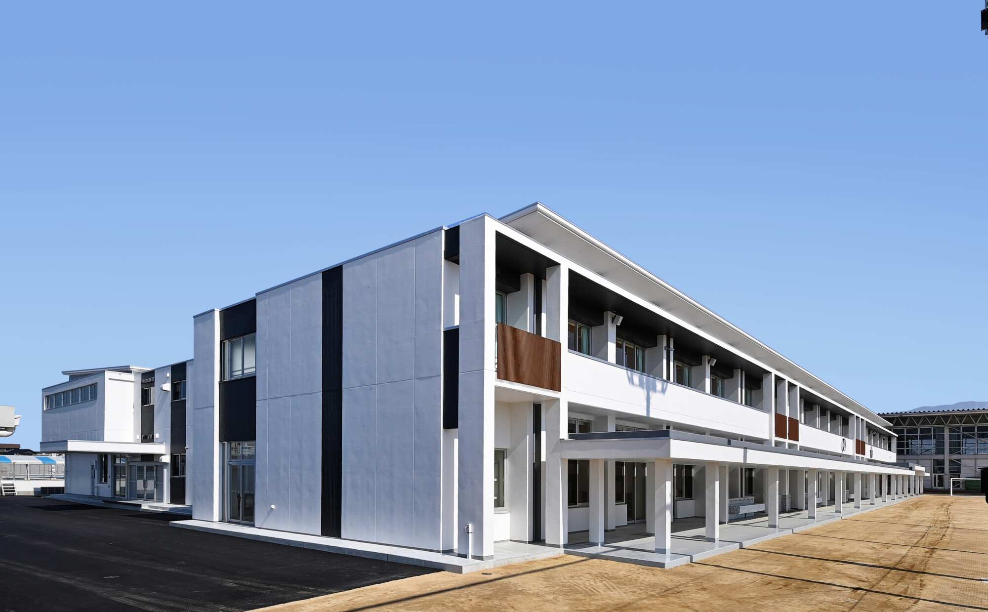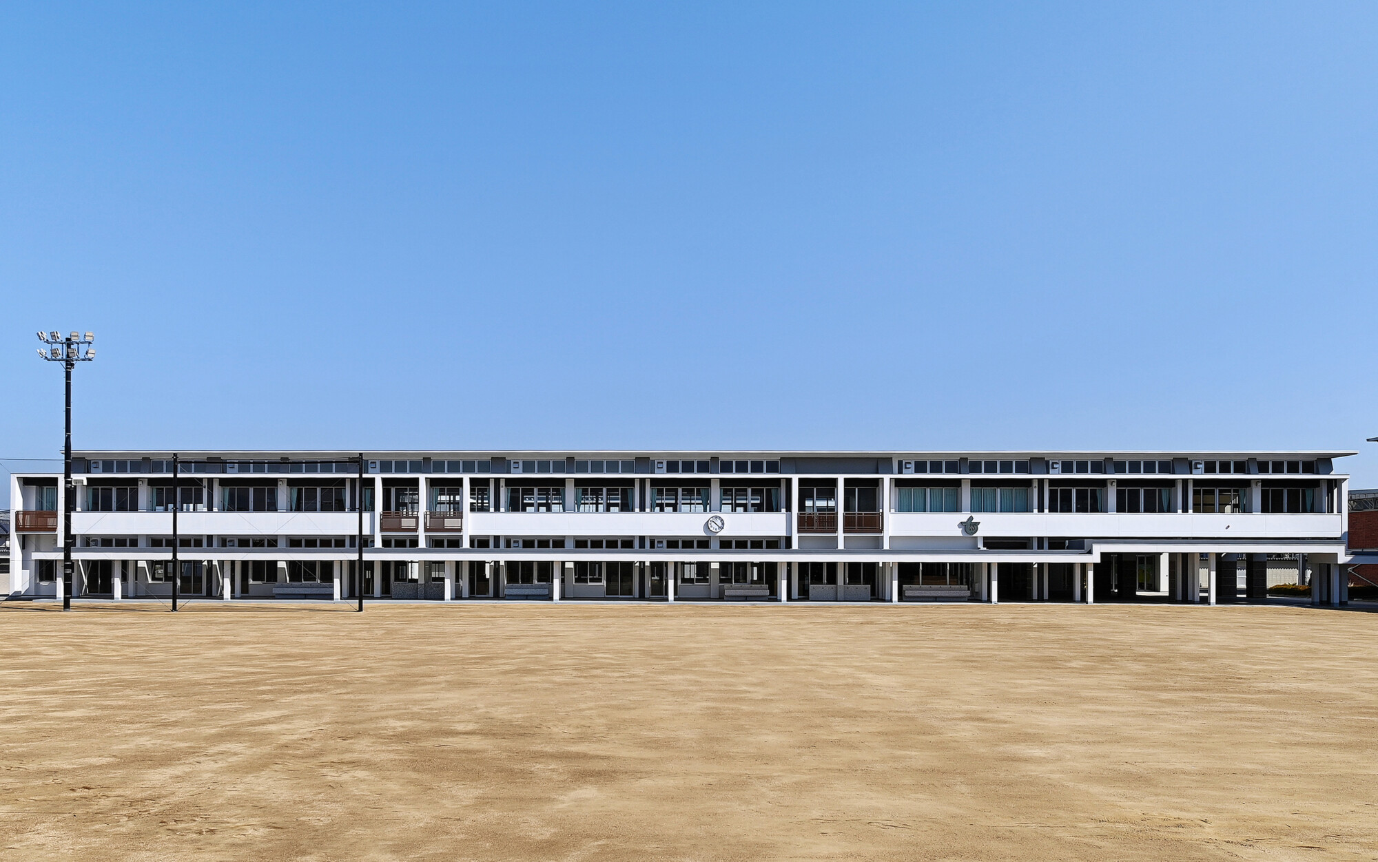 屋外運動場は、旧施設の改修で校舎と一体となるよう、増築およびデザイン改修を行いました。