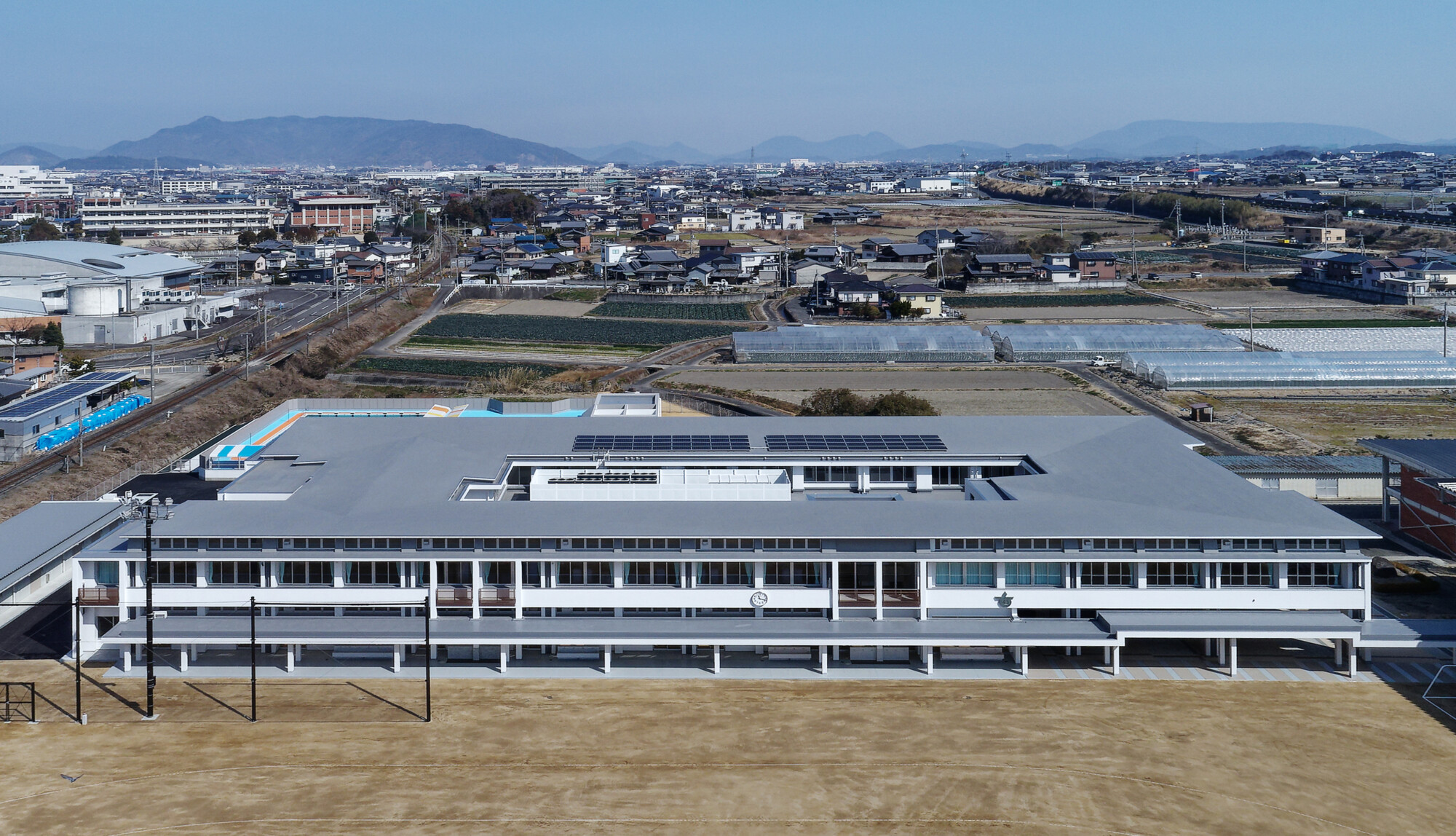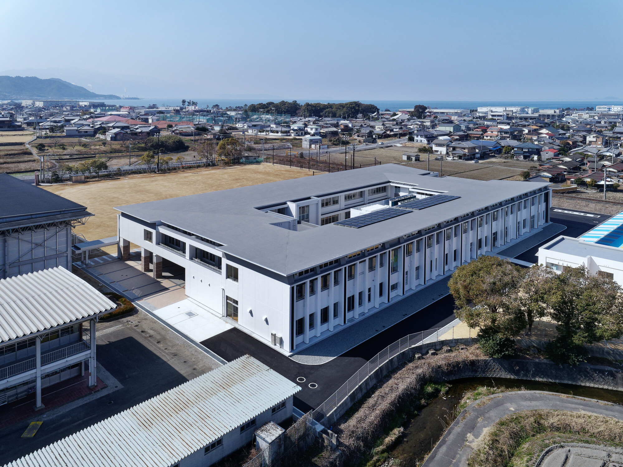 旧校舎は、香川県建築課の指導のもと1974年に完成、建築雑誌にも紹介された鉄骨トラスの軽快な屋根が特徴の先進的な学校です。